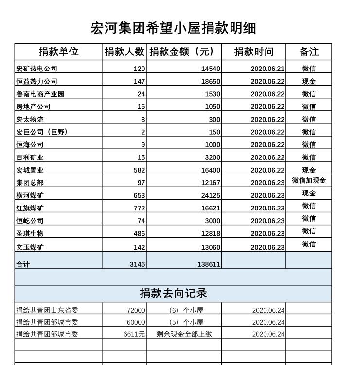 為幫助更多的適齡困境兒童實(shí)現(xiàn)夢想,響應(yīng)山東團(tuán)省委、山東省青聯(lián)實(shí)施“希望小屋”兒童關(guān)愛行動募捐倡議, 按照集團(tuán)黨委安排,集團(tuán)團(tuán)委組織動員廣大干部職工踴躍捐款,齊心協(xié)力匯聚愛心傳遞對貧困兒童的關(guān)愛,為更多有需求的兒童奉獻(xiàn)愛心,幫助他們打造渴求已久的學(xué)習(xí)生活空間。 6月23日,共筑“希望小屋”,捐建逐夢空間——宏河集團(tuán)“希望小屋”兒童關(guān)愛行動募捐儀式,在集團(tuán)總部舉行。 據(jù)統(tǒng)計(jì),宏河集團(tuán)希望小屋愛心捐款活動共籌集到愛心捐款:138611元。其中,捐款所得款項(xiàng)統(tǒng)一匯繳至共青團(tuán)山東省委、共青團(tuán)鄒城市委希望小屋工程項(xiàng)目,定向給鄒城市希望小屋項(xiàng)目建設(shè)。明細(xì)如下: 近年來,宏河集團(tuán)積極關(guān)注并致力于社會公益活動,通過黨、政、工、團(tuán)群體組織積極摸排協(xié)調(diào)并解決貧困職工家庭問題,特別是貧困殘疾人員家庭無獨(dú)立居住和學(xué)習(xí)環(huán)境孩子的教育問題。在以往金秋助學(xué)、愛心送考、精準(zhǔn)扶貧、慈心一日捐、抗疫捐款等工作及公益活動中,集團(tuán)秉承“幸福員工、鑄就未來、服務(wù)社會、溫暖人間”的企業(yè)使命,主動承擔(dān)社會責(zé)任,持續(xù)關(guān)心關(guān)注孩子們的生活和教育問題。希望通過此次為“希望小屋”的捐款,幫助更多孩子們健康成長。 |