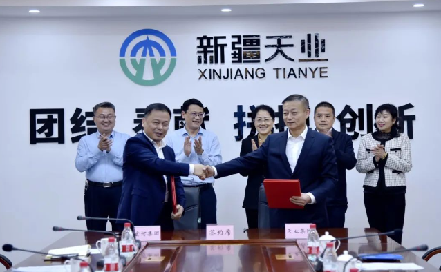 市委副書記、市長王建文見證協(xié)議簽署并致辭,市政協(xié)黨組成員、副主席、財政局黨委書記、局長張亮,市政府辦公室、稅務(wù)局、國企發(fā)展服務(wù)中心主要負(fù)責(zé)人參加活動。天業(yè)集團黨委書記、董事長宋曉玲,黨委副書記、總經(jīng)理周軍,首席法律顧問楊湘見證協(xié)議簽署。 (4月19日,在新疆天業(yè)集團,宏河集團黨委書記、董事長李曉東與天阜新業(yè)董事長歷建林簽署合作協(xié)議。)
