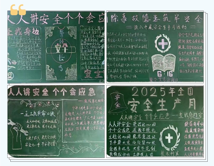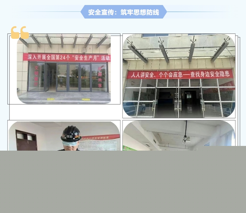 為營造“安全生產(chǎn)月”活動(dòng)的良好氛圍,我礦在辦公樓、掘進(jìn)樓、餐廳、入井走廊等顯著位置懸掛了“安全生產(chǎn)月”活動(dòng)條幅,組織“五科”專業(yè)科室繪制宣傳板報(bào),廣泛宣傳,進(jìn)一步引起全體干部職工對(duì)安全生產(chǎn)的廣泛關(guān)注和高度重視,并常態(tài)化進(jìn)行自救器盲戴培訓(xùn)、“六必知”知識(shí)考核,營造良好學(xué)習(xí)氛圍。
